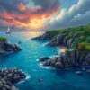 Ultimately, step back and admire your finished masterpiece. The dramatic seaside cliffs and tropical elements create stunning visual harmony. Your completed artwork brings coastal tranquility into any room.
