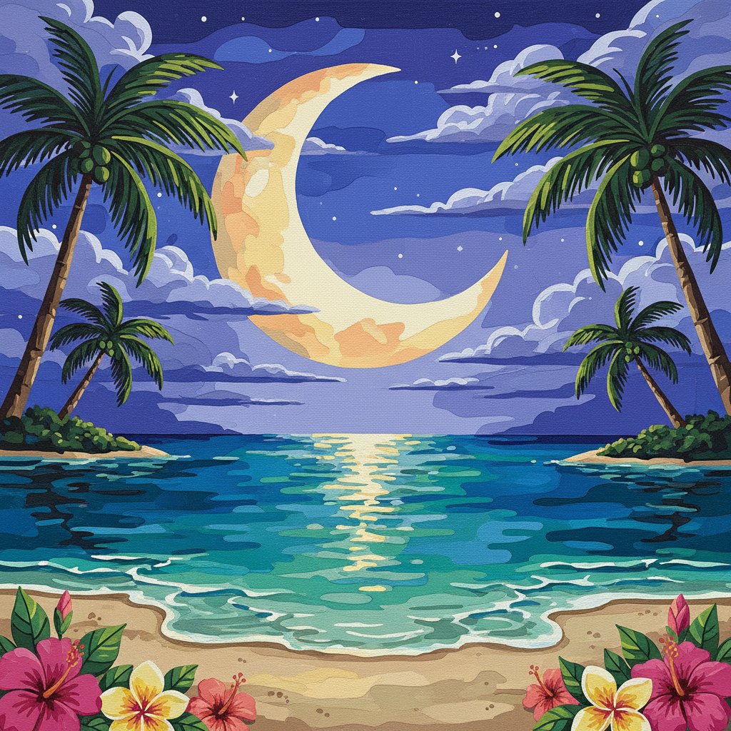 Transform your space with the enchanting Crescent Above Tropical Waters Paint By Numbers, where serene dusk meets tropical paradise. This stunning artwork captures a mystical crescent moon casting its gentle glow over tranquil waters.