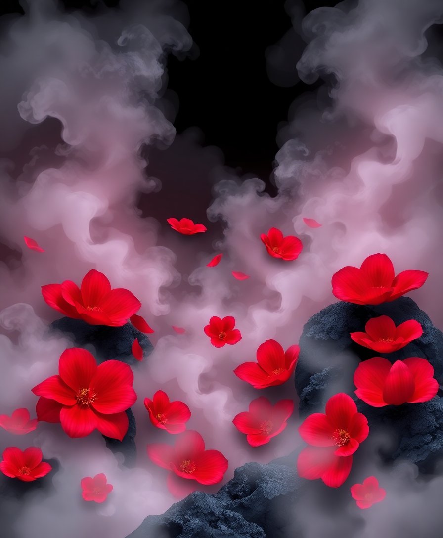 The dramatic contrast between crimson blooms and volcanic steam creates a uniquely moody atmosphere. This realistic design captures nature’s raw beauty in stunning detail.