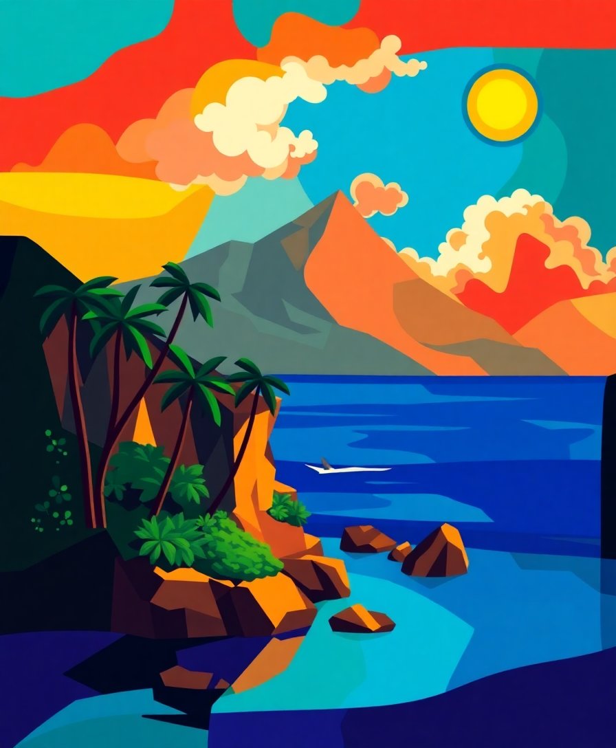 This unique combination of tropical island elements with geometric cubist techniques creates a distinctive vintage aesthetic. The muse-inspired composition offers both artistic challenge and visual appeal.