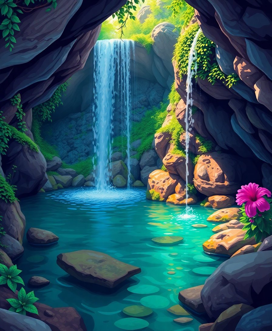 Ultimately, add the finest details with your small brush. These finishing touches bring depth and realism to your hidden waterfall grotto. Your completed masterpiece radiates tranquil beauty.