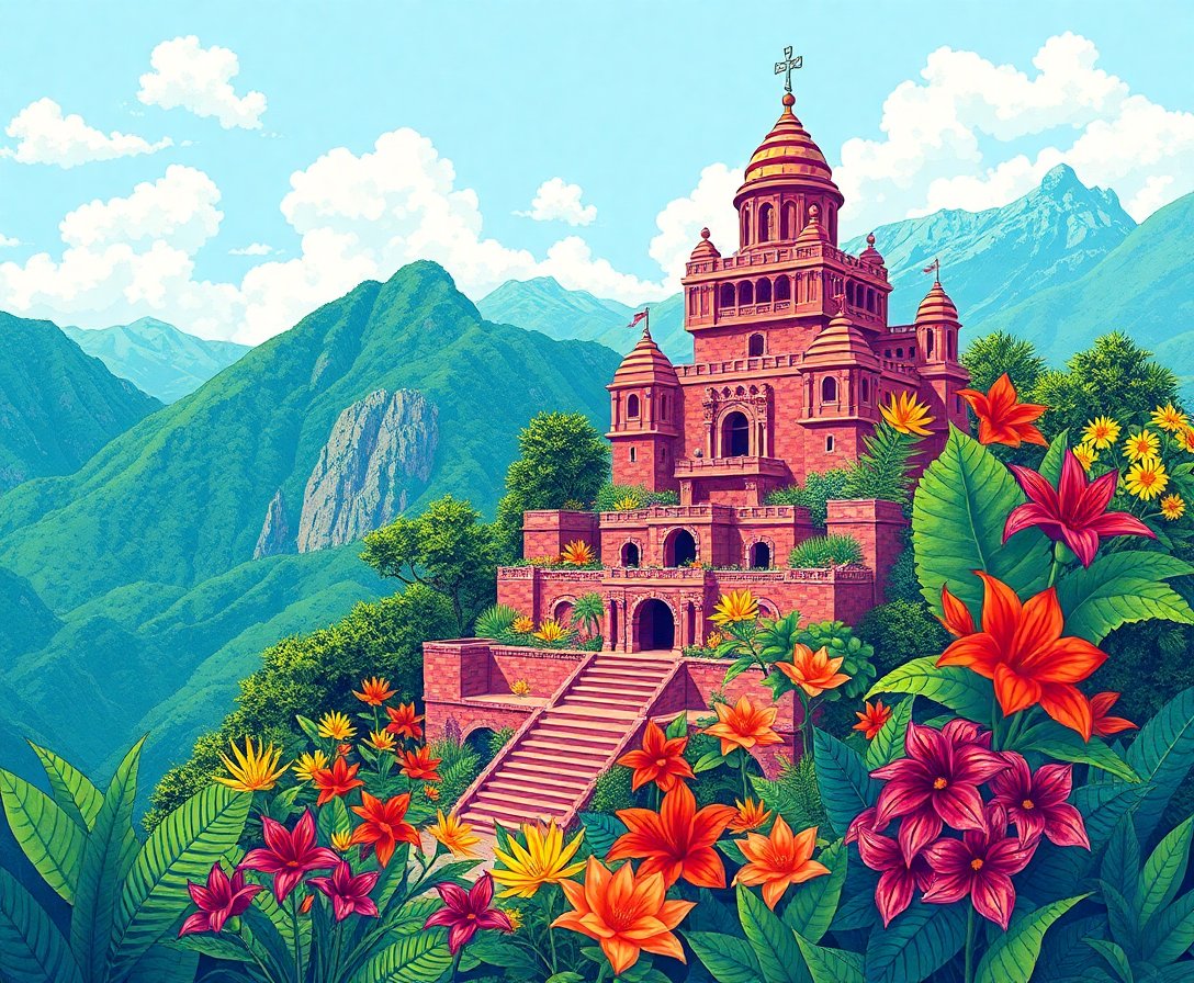 Ultimately, add final details to bring your citadel to life. Furthermore, highlight the pink blooms against weathered stones. Additionally, step back frequently to admire your progress. Consequently, you’ll witness your tropical ruins masterpiece emerge beautifully.