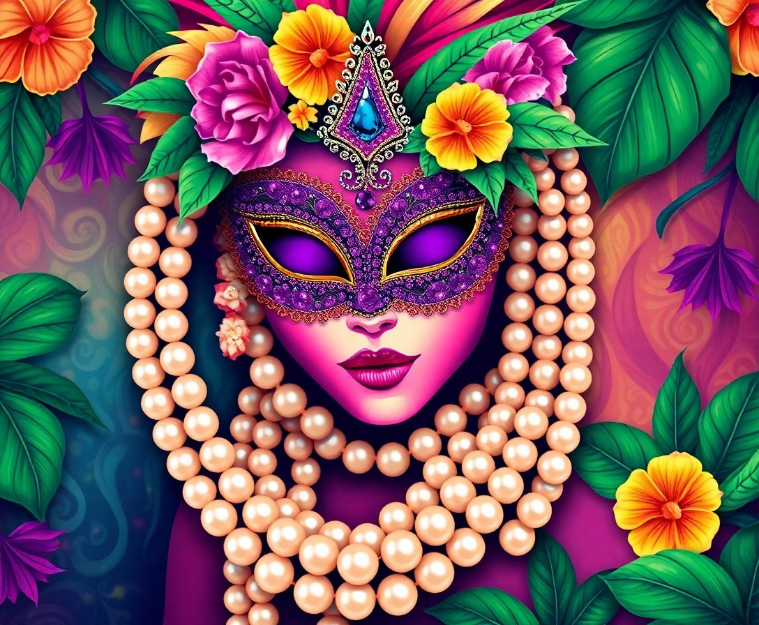 This kit features realistic tropical elements with opulent gold accents and pearl details, creating a luxurious Mardi Gras-inspired artwork perfect for festive decoration.
