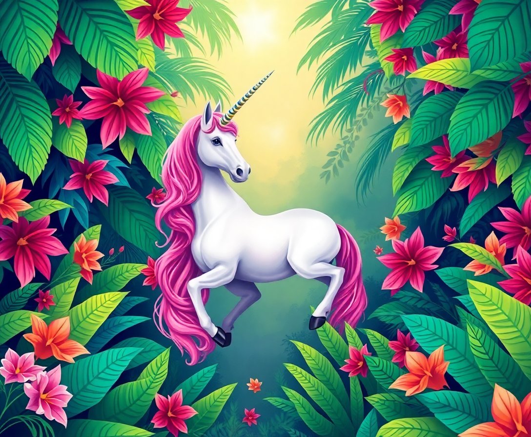 Ultimately, complete the darker foliage and shadow details that bring your unicorn to life. Step back and admire how each brushstroke contributes to the overall enchantment. Your finished piece radiates the peaceful magic of tropical dreams.