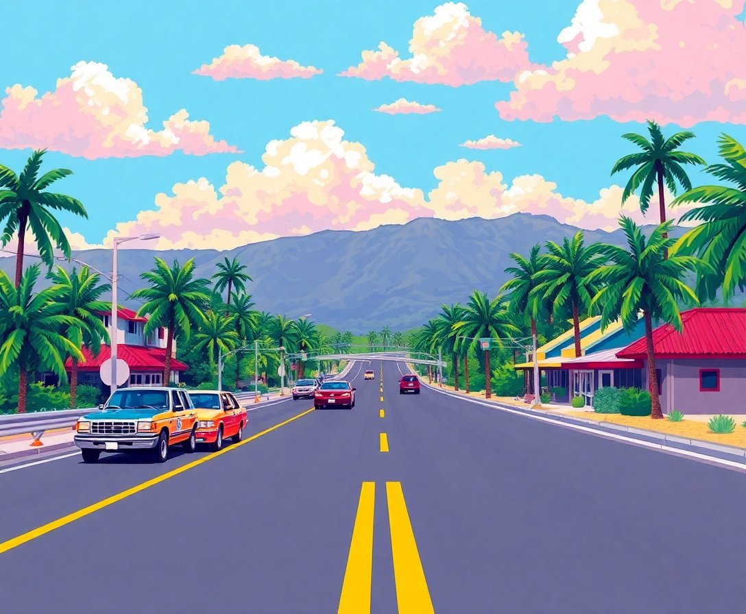 Ultimately, step back and admire your completed masterpiece. The vibrant tropical colors and classic car details create a stunning focal point. Your finished artwork embodies the spirit of American road trip adventures.