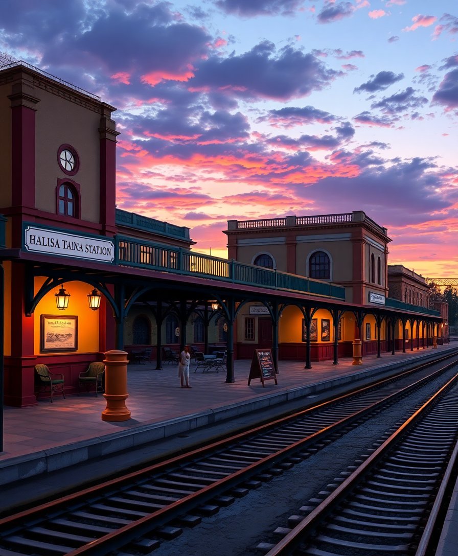 Ultimately, add final details to windows and railway elements for authentic vintage character. Your completed masterpiece showcases the romantic ambiance of this historic station at dusk.