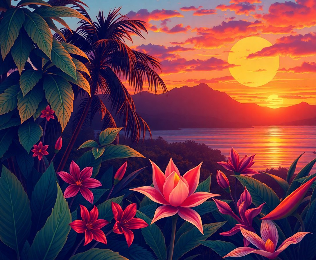 Experience the joy of creating beautiful art with this exceptional paint by numbers kit. Transform blank canvas into a stunning tropical masterpiece that captures the magic of dusk over exotic botanicals.