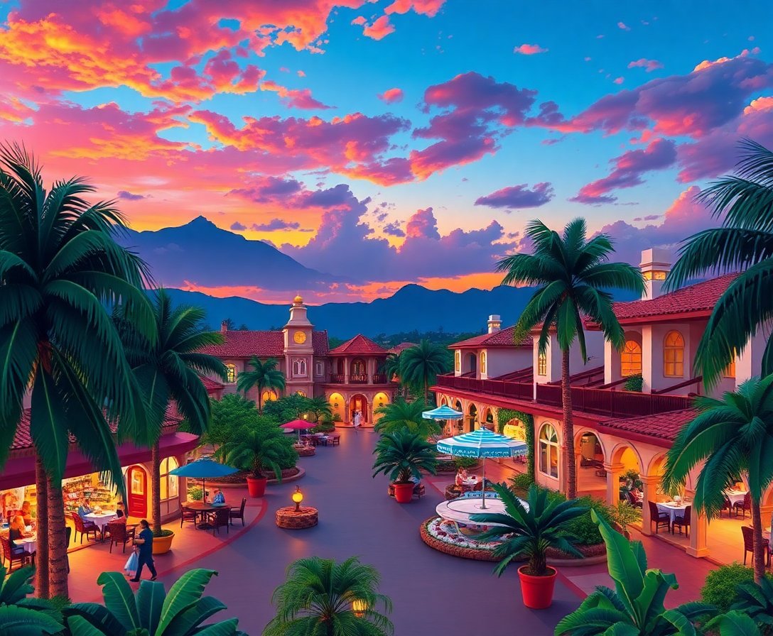 Ultimately, watch your tropical plaza come alive with warm twilight hues. Furthermore, the finished piece showcases realistic streetlights casting golden glows across vintage cobblestone surfaces. Your artistic achievement awaits proud display.