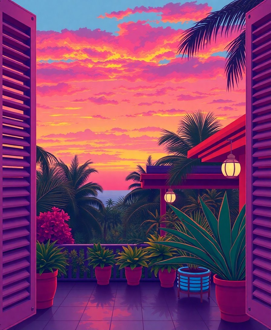 Experience the joy of creating your own tropical dusk masterpiece today. Furthermore, this retro louver scene brings endless summer vibes to any space.