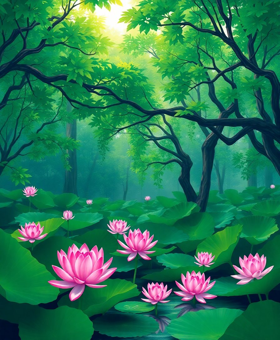 The emerald lotus blooms and intricate banyan root system create exceptional visual depth. Additionally, the realistic shadows and pond reflections make this design truly captivating.