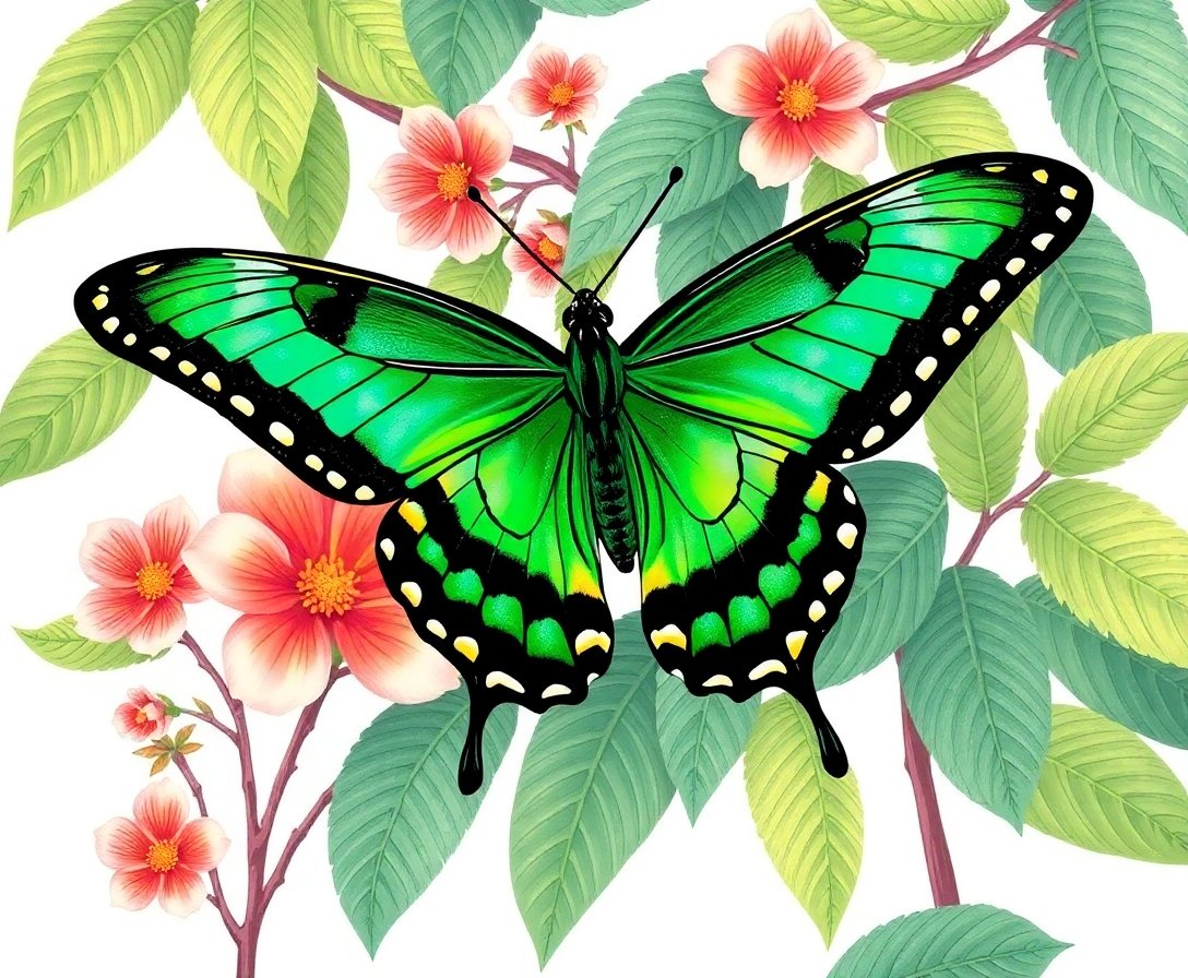 Finally, apply finishing touches to complete your stunning botanical masterpiece. The detailed swallowtail emerges beautifully against the vintage-style background. Your completed artwork becomes a sophisticated conversation piece.