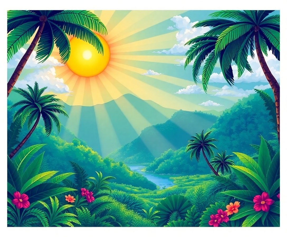 Ultimately, step back and admire your completed tropical valley masterpiece. The emerald hues and golden sunrays create a stunning focal point for any room. Your finished artwork captures the serene beauty of nature’s most magnificent moments.