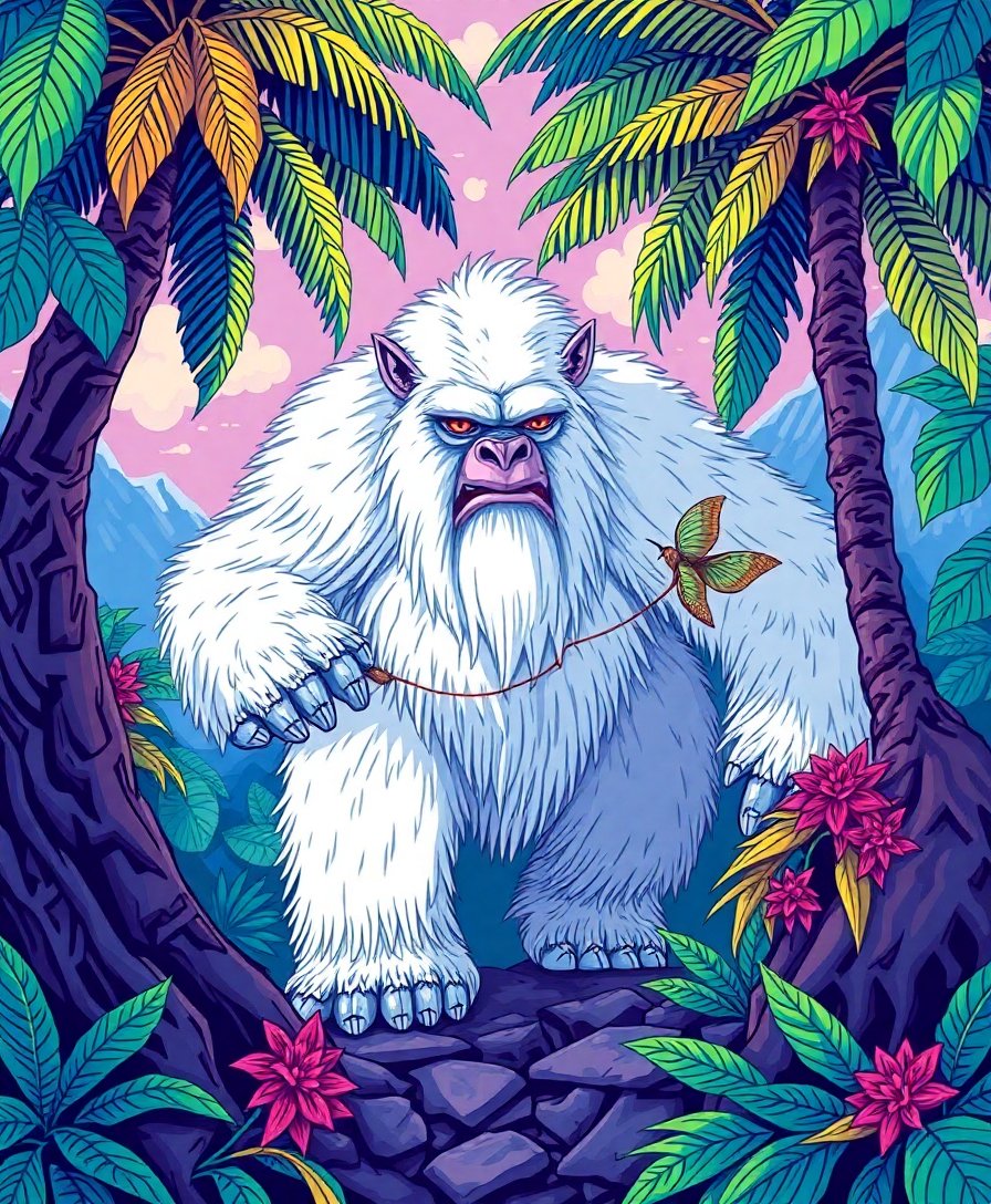 Ultimately, step back and admire your completed tropical yeti masterpiece. The finished artwork captures both the mystery of cryptozoological legends and the vibrant beauty of tropical landscapes perfectly.