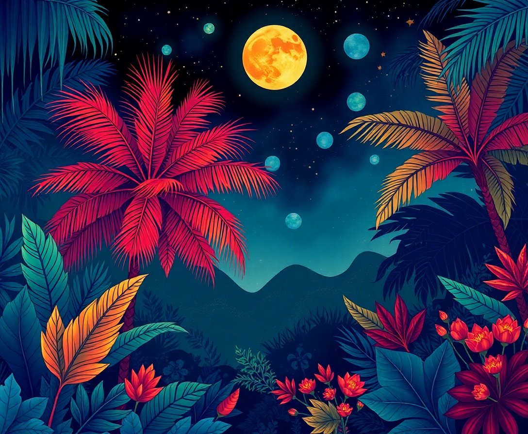 What makes this tropical nightscape design unique?