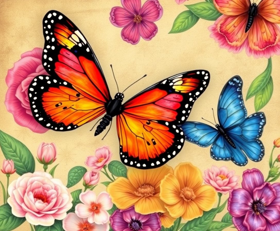 Ultimately, step back and admire your completed masterpiece showcasing graceful butterflies amid botanical illustrations. Therefore, your artistic journey culminates in a stunning piece ready for display or gifting.