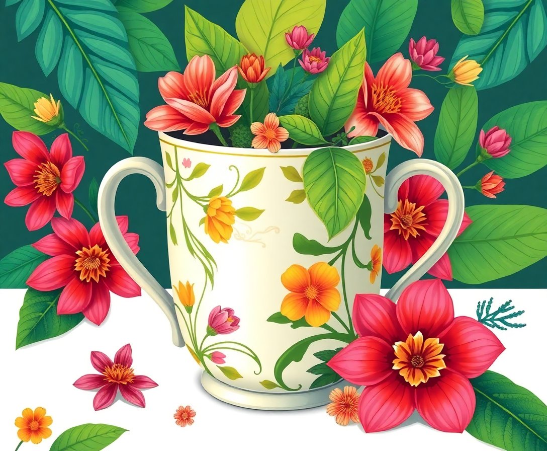 Transform your space with the captivating beauty of our Exotic Botanical Tea Mug Paint By Numbers kit. This stunning artwork combines vintage charm with realistic botanical details. Furthermore, it creates a perfect centerpiece for any kitchen or cozy interior space.