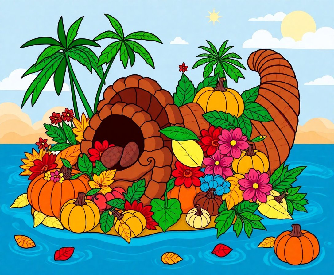 This unique blend combines traditional cornucopia elements with exotic island scenery. The warm sunset colors and lush foliage create a distinctive thanksgiving celebration theme.