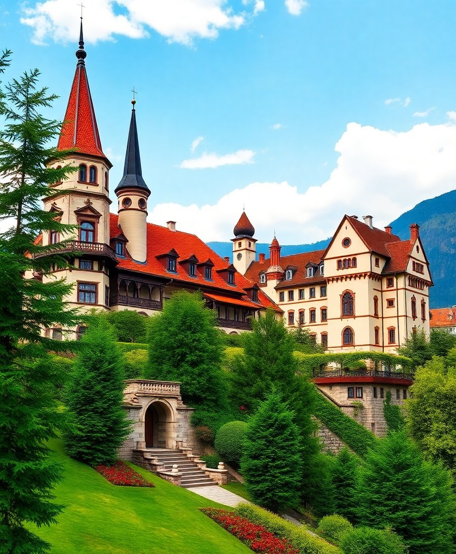 Ultimately, step back and admire your finished creation showcasing tropical foliage framing majestic Bavarian architecture. Furthermore, apply final touches to enhance details and prepare for proud display in your chosen space.