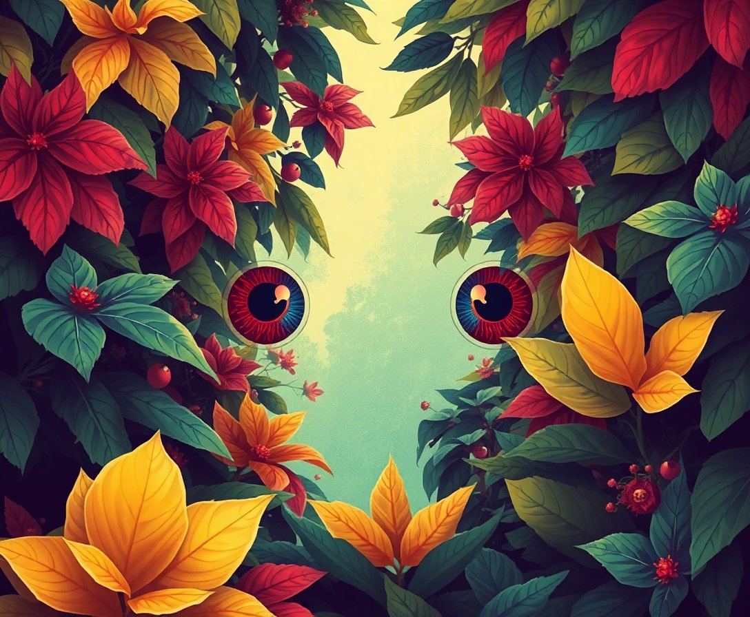 This eerie sci-fi artwork features mysterious observer eyes hidden within lush botanical vines, creating a unique mid-century aesthetic that’s perfect for entertainment spaces.