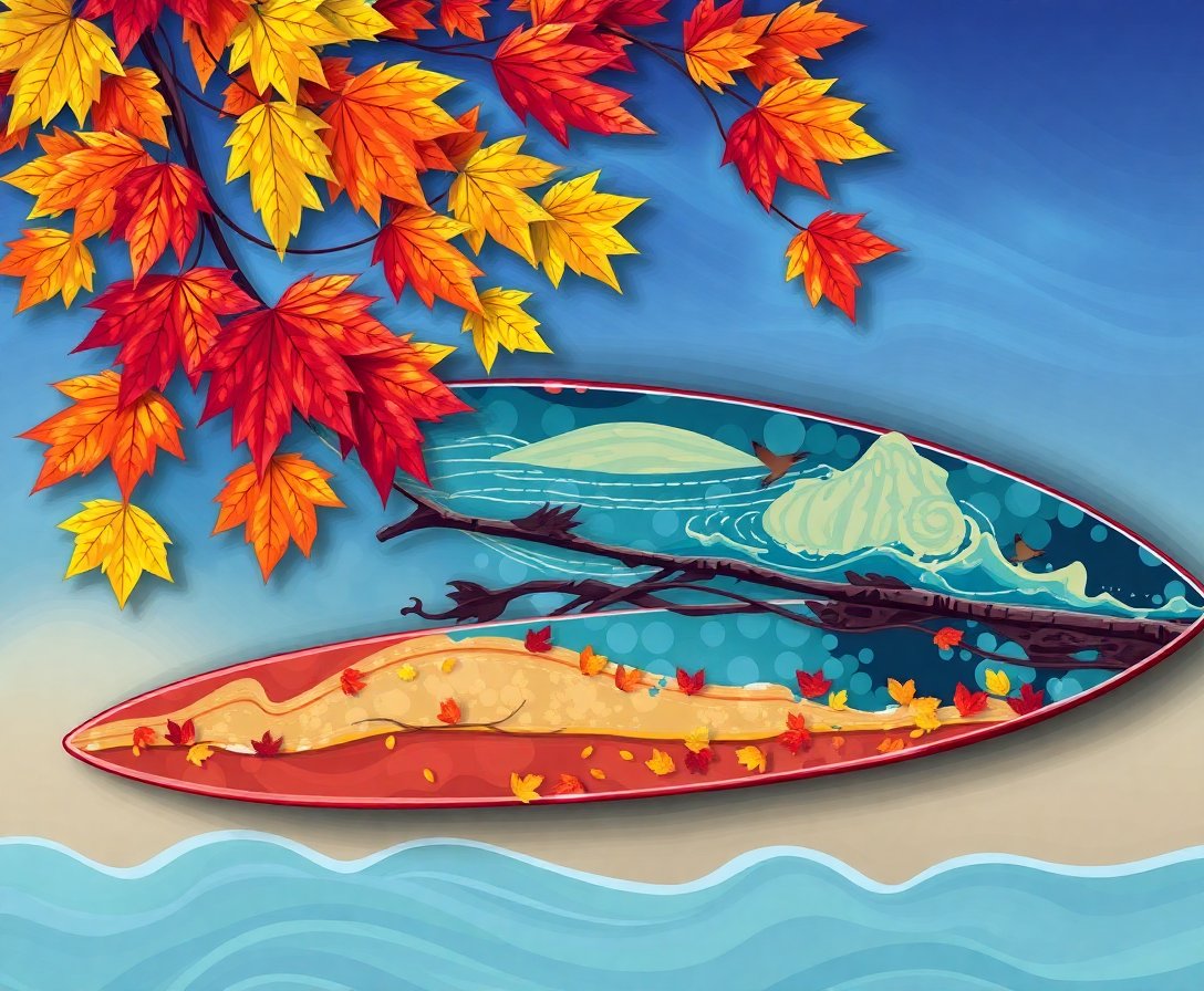Create your own piece of autumn nostalgia today. This vintage surfboard scene brings together the best of both worlds. The weathered textures tell stories of countless beach adventures beneath falling leaves.