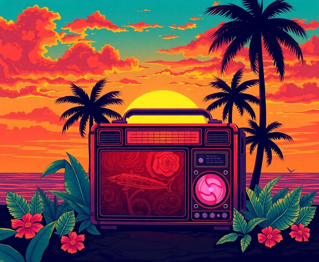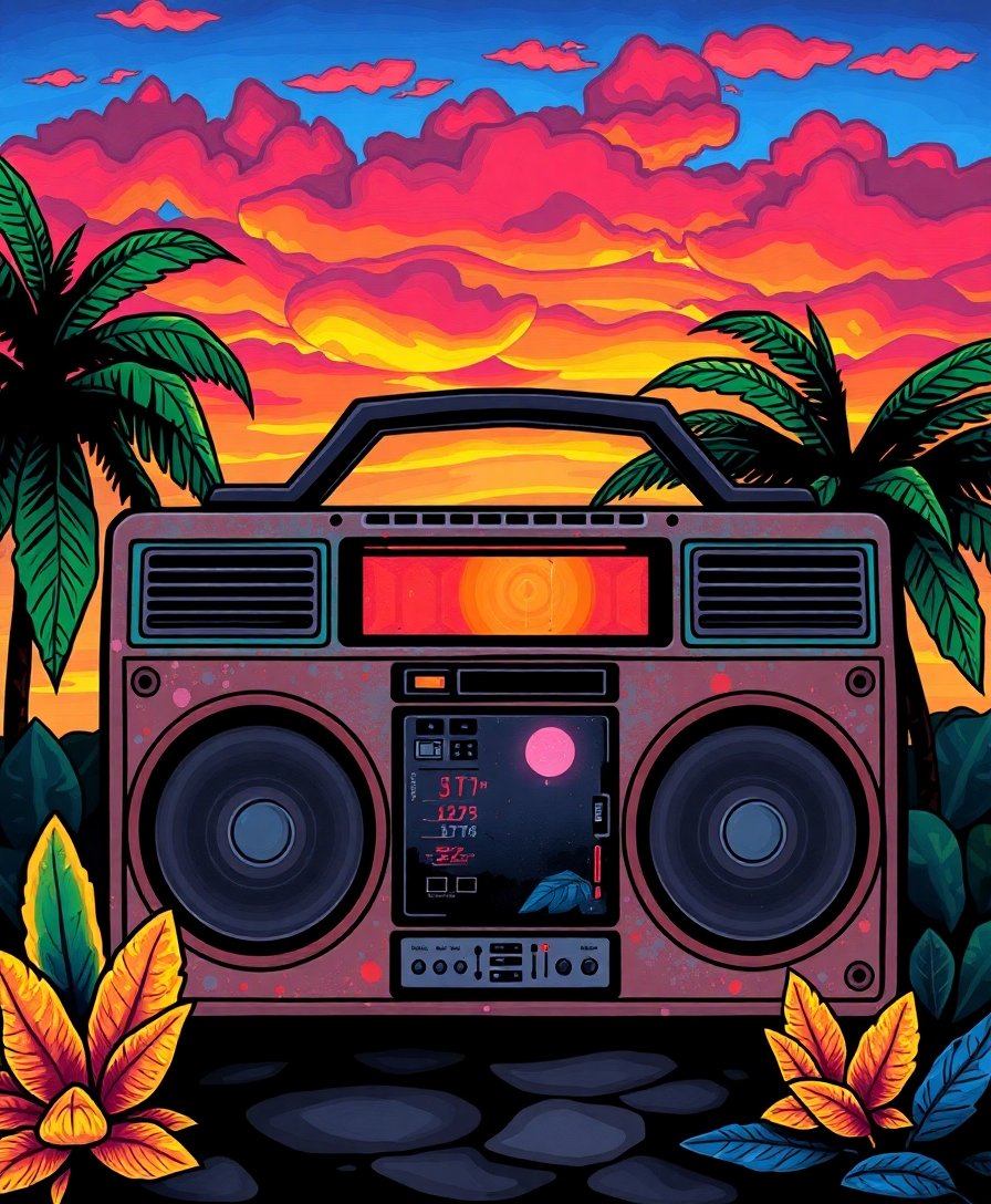 Ultimately, step back and admire your completed masterpiece. Additionally, the vibrant tropical sunset perfectly complements the vintage boombox design. Your finished artwork radiates eighties nostalgia and artistic achievement.