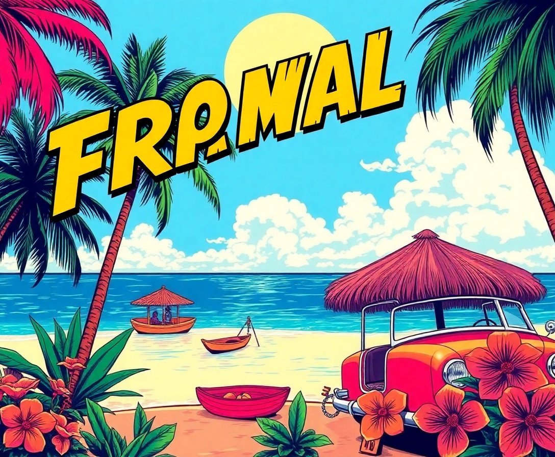 Ultimately, step back and admire your completed vintage masterpiece. Furthermore, the distressed aesthetic captures authentic comic book nostalgia. Finally, your finished artwork celebrates both tropical paradise and golden era comic artistry.