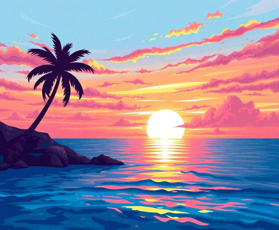 Ultimately, step back and admire your completed masterpiece. The realistic ocean dusk scene now radiates tranquil beauty. Your vintage-style tropical horizon captures the essence of peaceful evening moments.