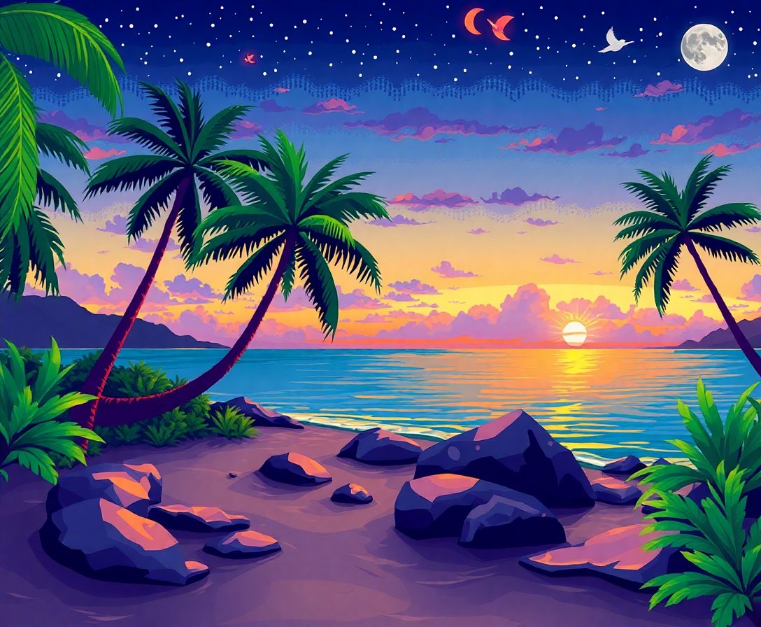Create your own tropical sanctuary with this enchanting paint by numbers kit. Each session transports you to serene shorelines where twilight paints the sky in magnificent hues.