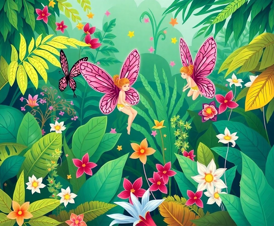 Subsequently, begin with lighter tones and gradually progress to deeper shades. Paint each fairy wing delicately using small brush strokes. Work systematically across the tropical ferns using medium brushes. Allow each section to dry completely before proceeding.