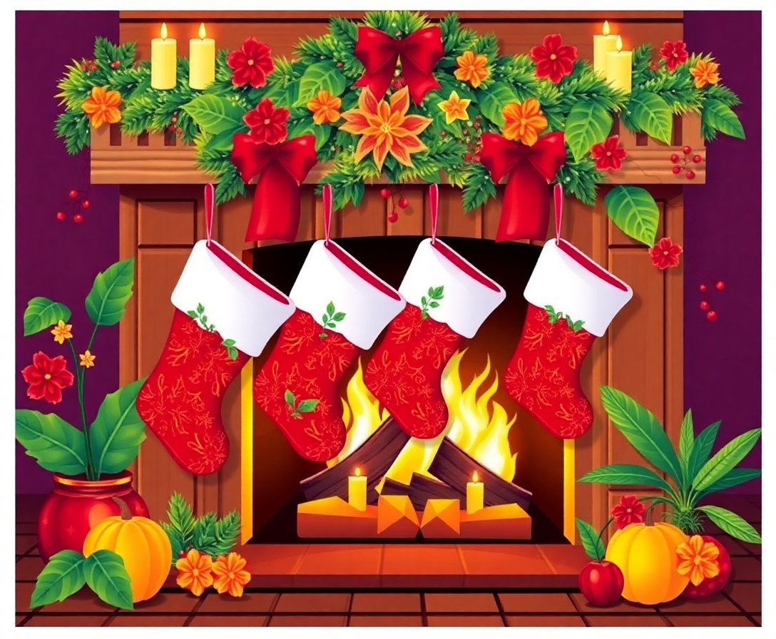 Transform your holiday decorating with this enchanting Festive Tropical Fireplace Stockings Paint By Numbers design. This unique artwork blends traditional Christmas warmth with exotic palm garland accents. Create a stunning vintage-inspired masterpiece that celebrates the season.