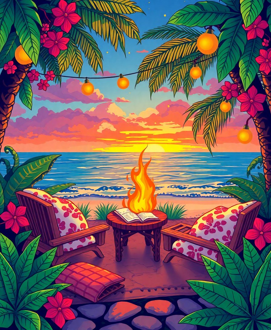 This unique design combines cozy warmth with vibrant tropical elements, creating a perfect balance of comfort and adventure. The realistic stationery details add authentic charm to your finished artwork.