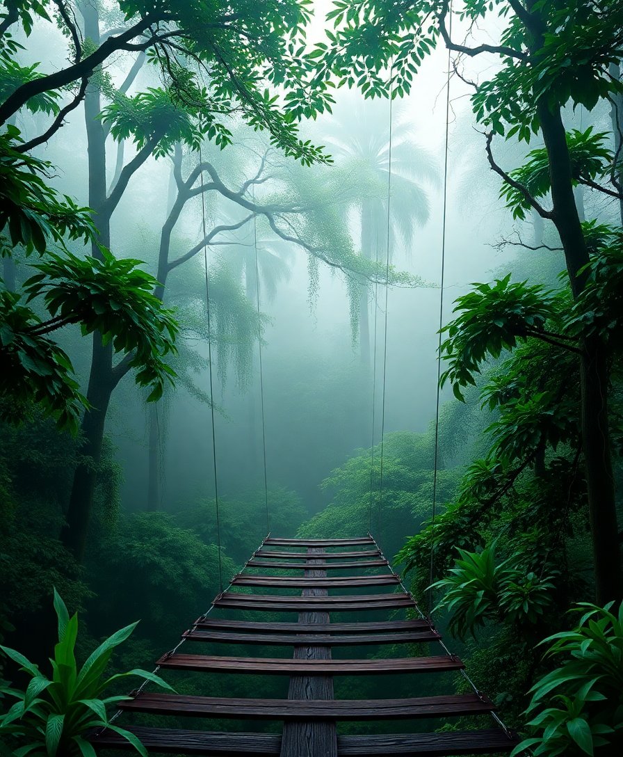 Ultimately, add the final touches to bring your rainforest scene to life. Apply darker greens for lush foliage depth. Additionally, enhance the bridge’s weathered wood texture. Your completed masterpiece will showcase nature’s serene beauty perfectly.