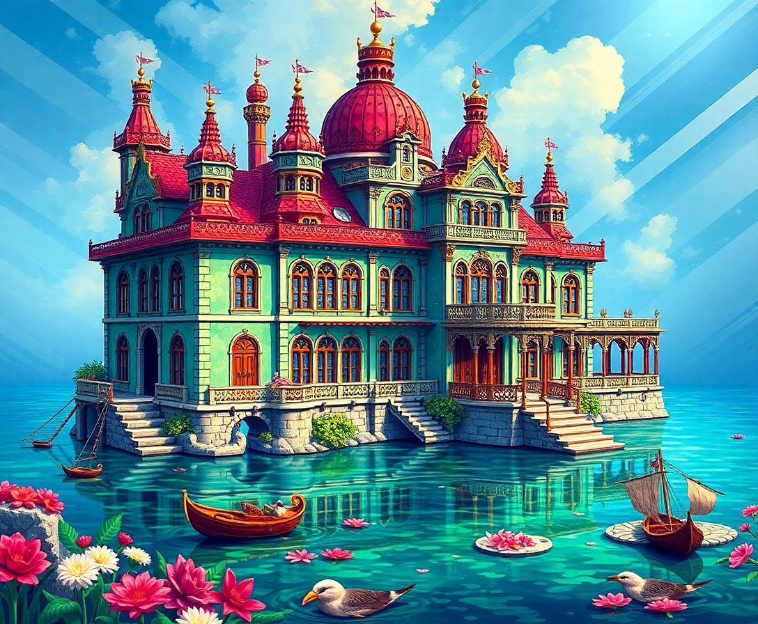 Transform your creative space with the breathtaking Forgotten Emerald Lagoon Palace Paint By Numbers, a captivating artistic journey that brings ancient romance to life. This stunning kit captures the mystical allure of a historic palace rising from emerald waters, surrounded by verdant palms and weathered stone.