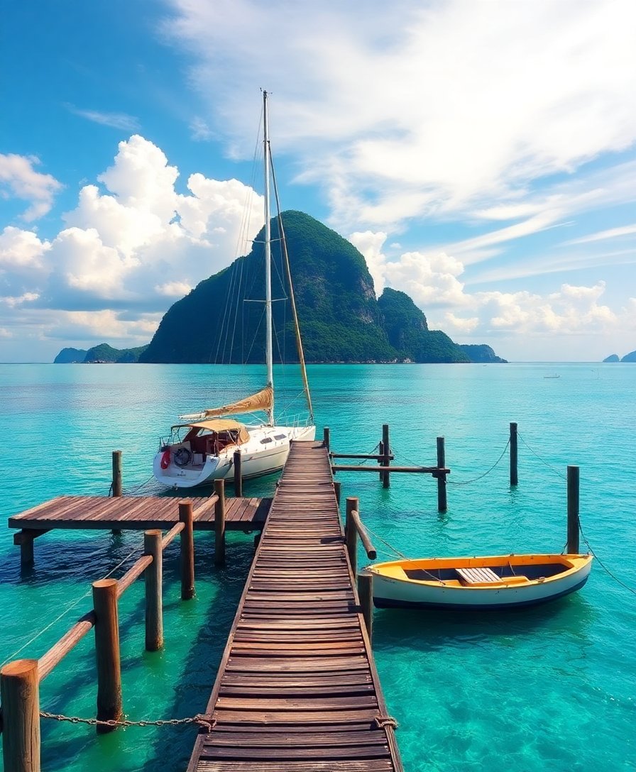 Ultimately, step back and admire your completed tropical paradise. Furthermore, the realistic details of the weathered pier and peaceful catamaran create a stunning focal point. Consequently, your finished artwork becomes a window to this serene island escape.