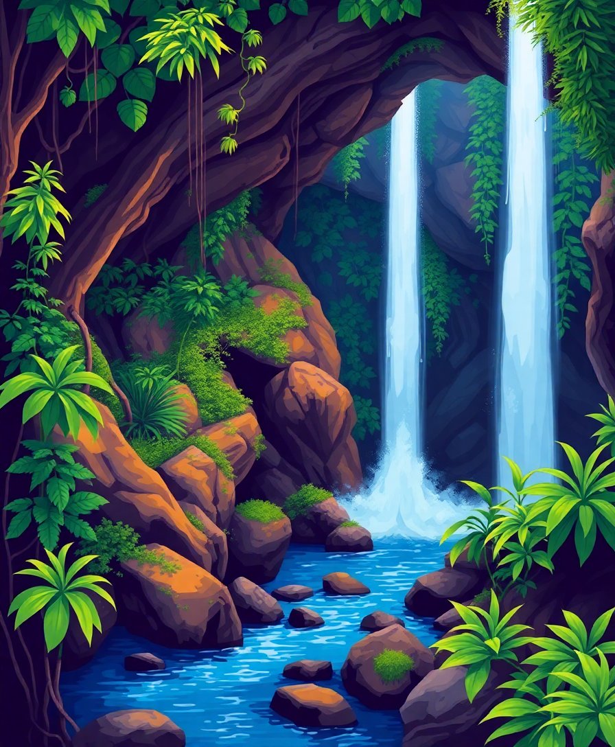 Ultimately, step back and admire your completed tropical masterpiece as it comes to life. Furthermore, the realistic details of the grotto’s emerald depths create a stunning focal point. Your finished artwork captures the serene beauty of this hidden waterfall sanctuary.