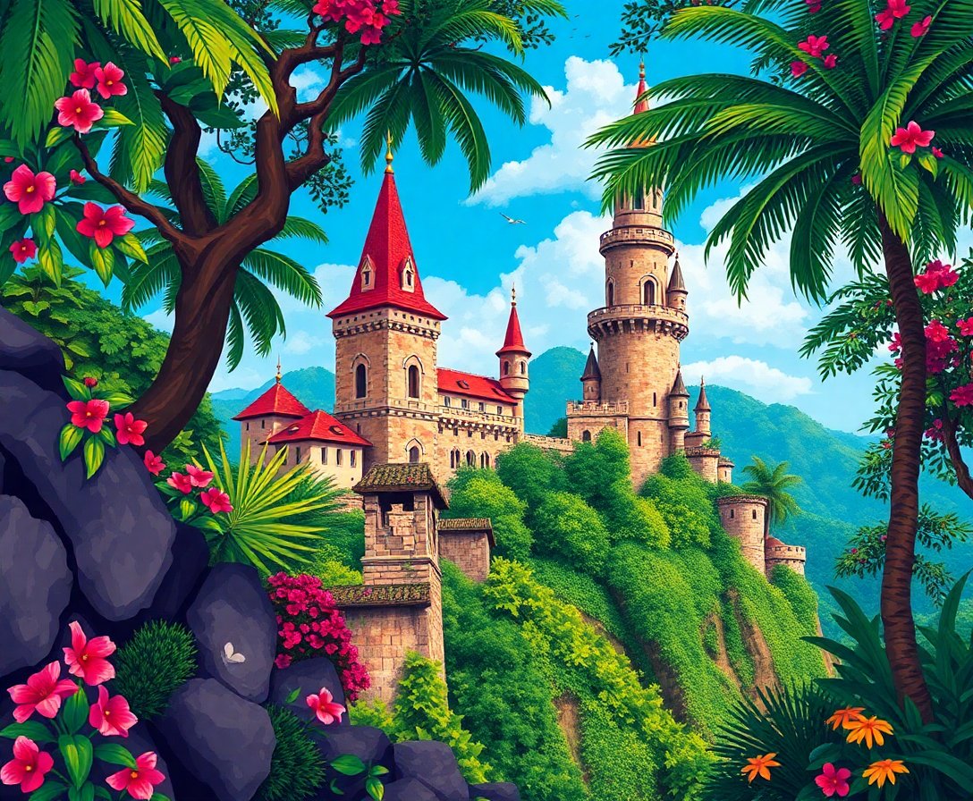 The high-quality linen canvas measures 16×20 inches, providing ample space for detailed tropical castle architecture. This standard size fits most frames and display spaces perfectly.