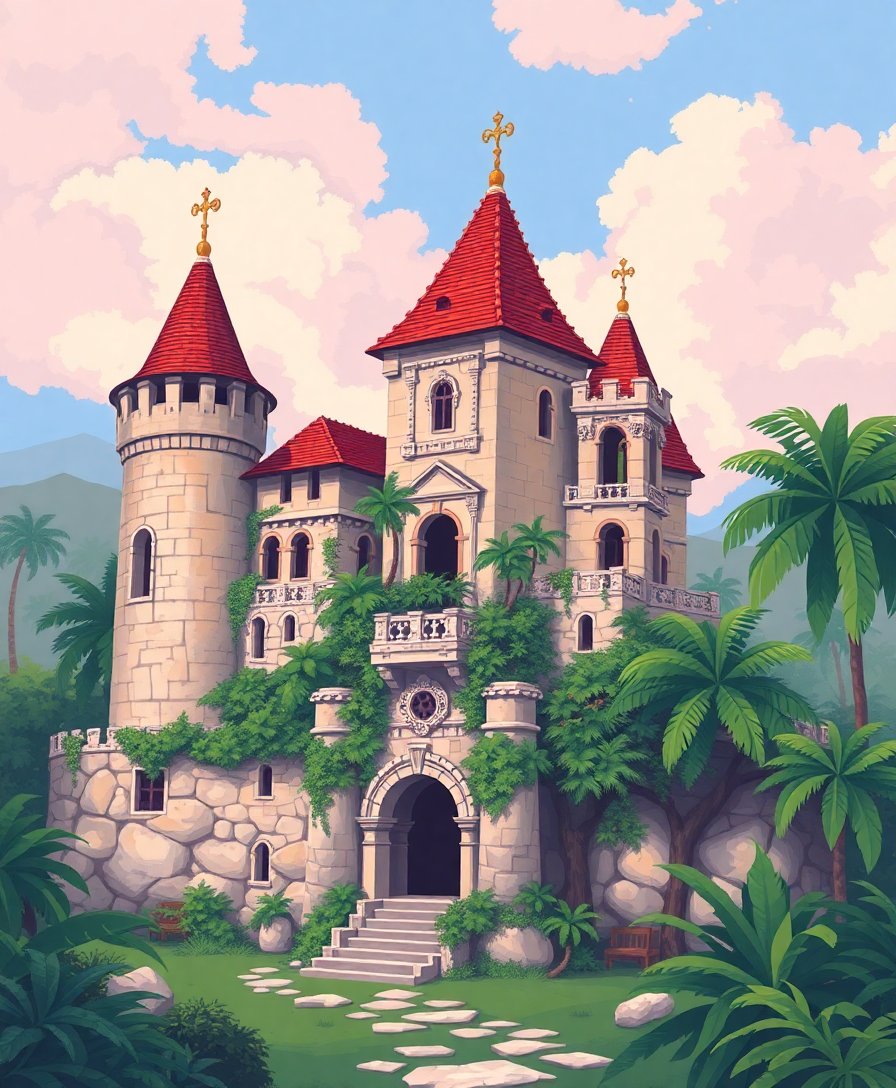 Transform your creative space with this enchanting Forgotten Tropical Stone Keep Paint By Numbers masterpiece. This captivating design blends medieval architecture with lush tropical elements. Every brushstroke brings you closer to completing your own vintage castle artwork.