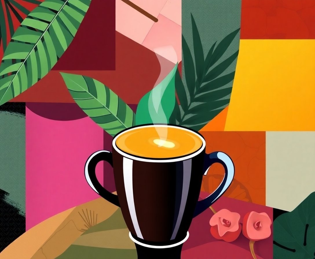 This unique design combines geometric fragmentation with warm tropical coffee themes, creating a sophisticated blend of abstract art and realistic elements perfect for modern decor.