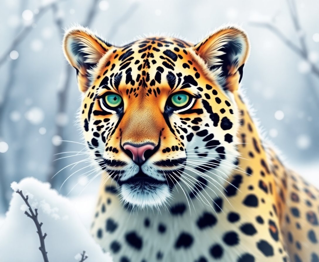 This unique artwork combines tropical banana leaf patterns with frosted winter effects, creating a stunning contrast. The realistic snow leopard imagery showcases intricate details and professional-quality results.
