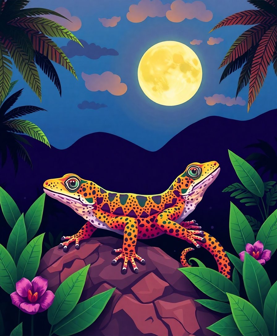 Transform your artistic vision into reality with this captivating Gecko Under Tropical Moon Paint By Numbers kit. This stunning design captures a luminous banded gecko basking beneath a glowing tropical moon, creating an enchanting oasis of color and tranquility. Perfect for artists seeking to explore exotic desert wildlife through the meditative art of painting.