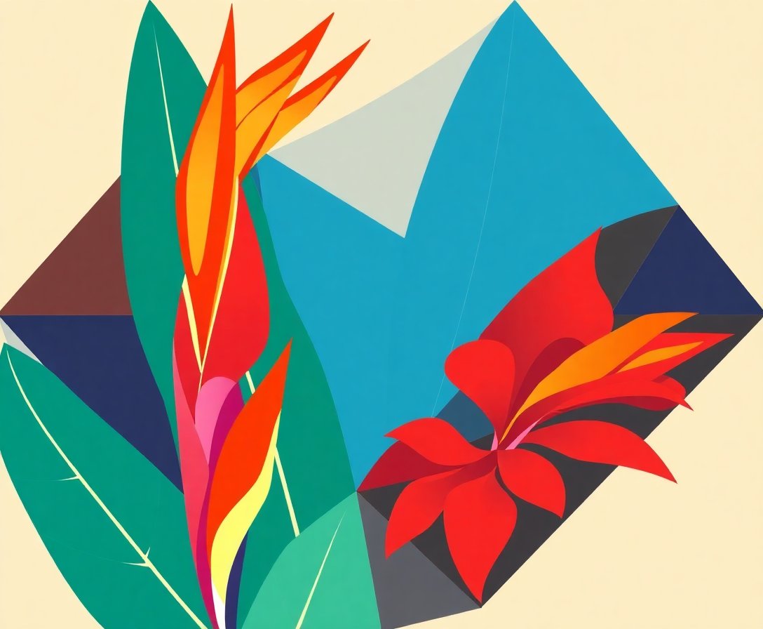 The geometric patterns and vivid tropical colors capture authentic mid-century modern aesthetics. This design perfectly balances botanical beauty with atomic age sophistication.