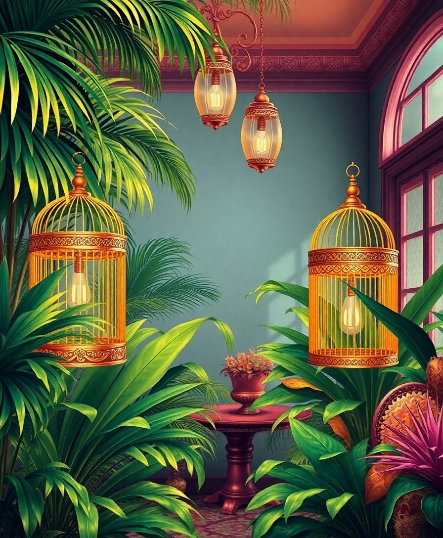 The intricate Victorian parlor scene combines realistic finches with lush tropical palms and ornate gilded cages. The velvet-like textures create stunning visual depth perfect for cozy indoor spaces.