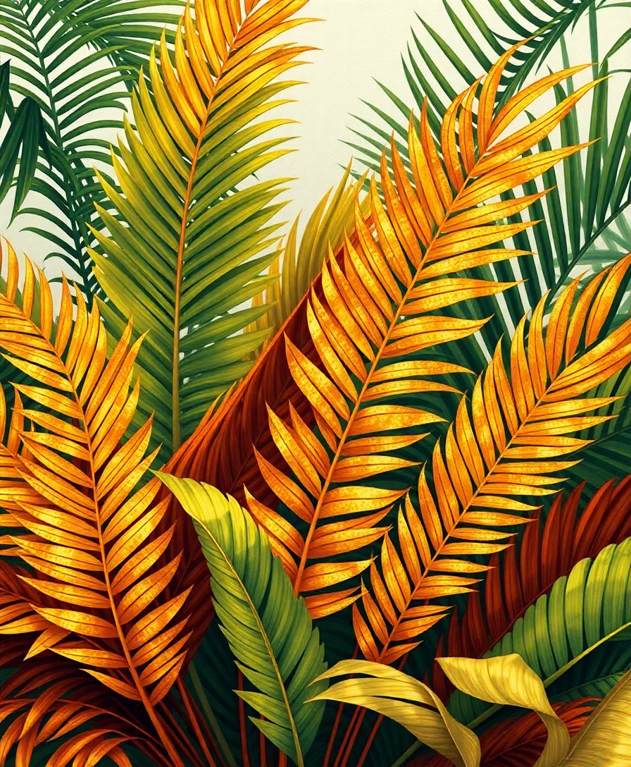 The gilded elements use specially formulated metallic paints that create realistic shine and depth. These golden highlights bring tropical fronds to life with sophisticated elegance.