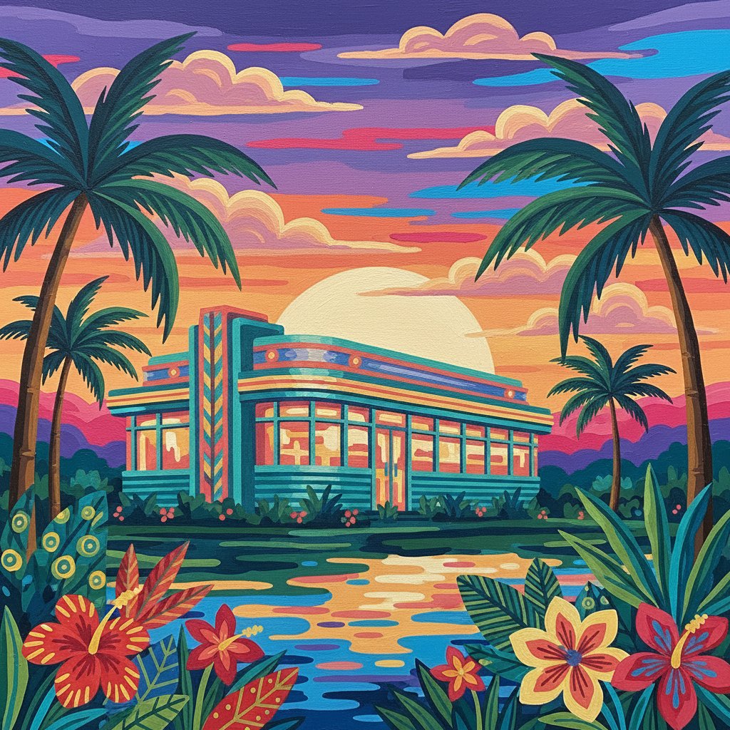 Transform your space with the captivating Glass Diner Tropical Dusk Paint By Numbers, where Art Deco elegance meets vibrant neon cityscape beauty. This stunning kit captures the essence of a tropical evening through architectural brilliance and atmospheric lighting.