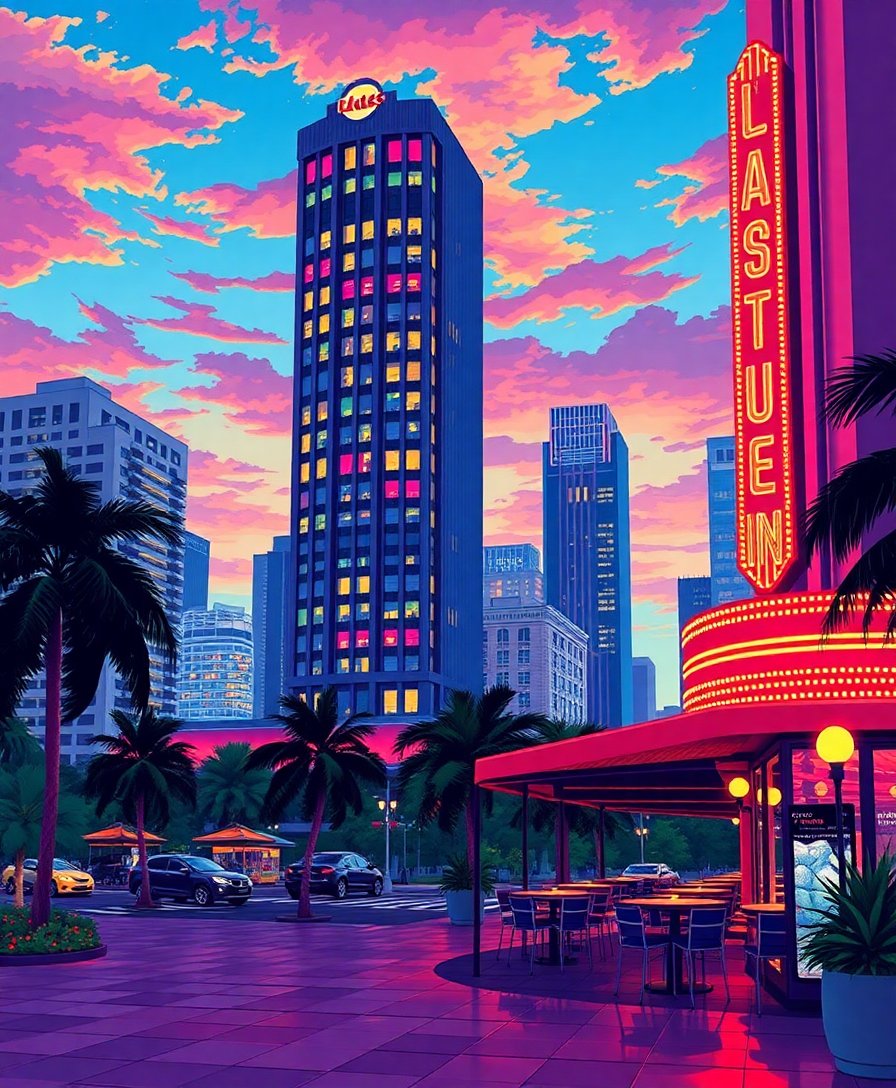 Ultimately, witness your tropical dusk scene come alive with vibrant neon reflections. Additionally, the finished piece showcases Art Deco Skyscrapers bathed in atmospheric twilight glow.