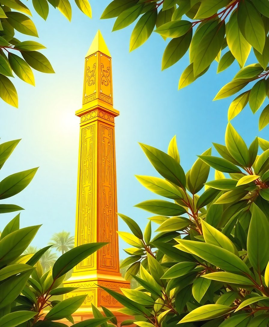 This design combines authentic Egyptian obelisk details with lush jungle foliage, creating a unique cultural and natural fusion. The golden radiance and realistic textures make it a stunning conversation piece.