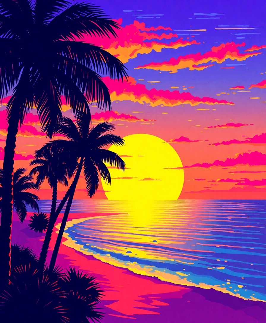 Ultimately, step back and admire your completed vaporwave masterpiece as it transforms any room. Therefore, the glitched sunset effect creates an mesmerizing focal point. Finally, the tropical palms add depth and contrast to your artistic achievement.