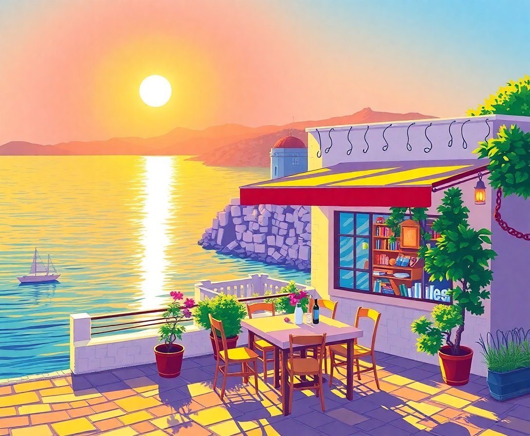 Ultimately, step back and admire your finished masterpiece. Consequently, the completed artwork captures the magical coastal ambiance perfectly. Finally, your Aegean cafe glows with warmth and authenticity.