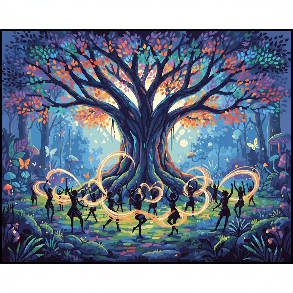 Transform your creative space with the electrifying energy of the Glowing Banyan Dance Party Paint By Numbers. This stunning vintage concert poster inspired design captures the vibrant atmosphere of an unforgettable outdoor celebration. Neon lights dance through mystical banyan branches while silhouettes groove beneath the luminous canopy.