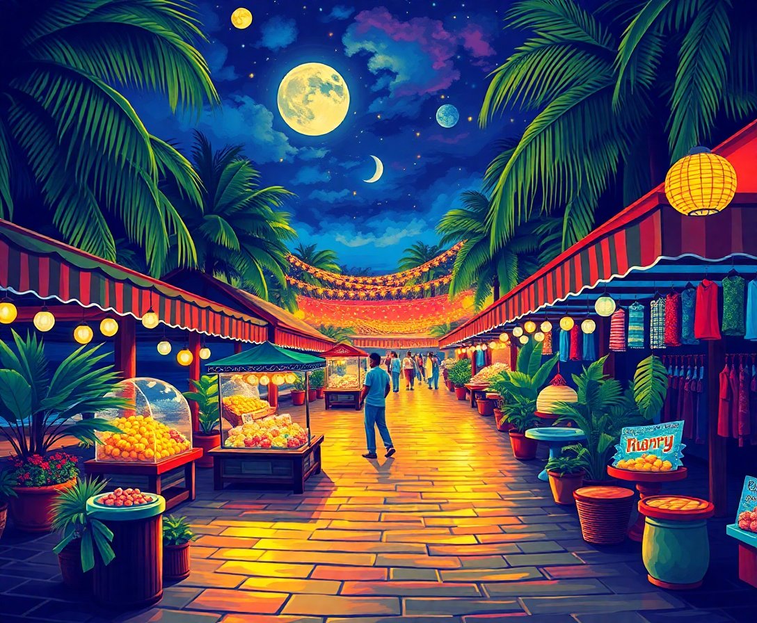 Ultimately, add the final details of glowing bulbs and nightlife elements to bring your bazaar scene to life. These finishing touches transform your canvas into a radiant celebration of island festivity that captures the magic of tropical twilight.